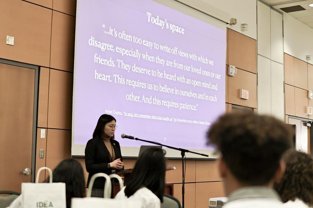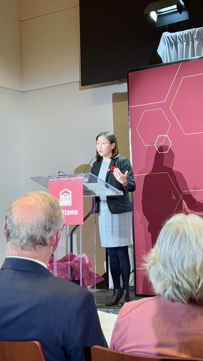 Michelle speaking at a March 2023 University of Ottawa event celebrating the Dellelce Family’s transformation $5M gift to the Faculty of Law. Photo courtesy of the Common Law Section, University of Ottawa.